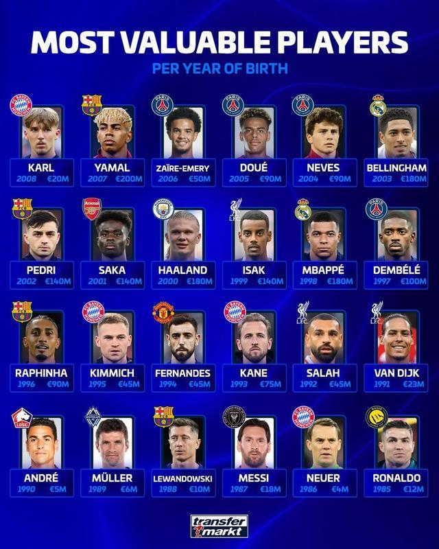 北京时间10月27日,德国转会市场列出了当下各年龄段身价最高的24名球员,年龄范围涵盖1985-2008年出生的球员。